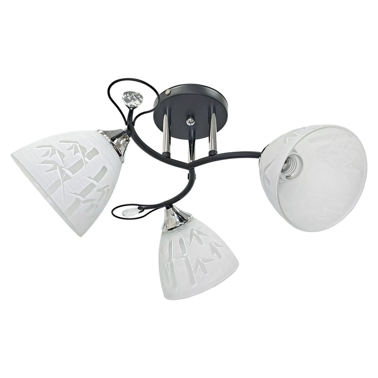 Люстра потолочная с круглым основанием и с тройным цельно - литым кронштейном, на котором расположены 3 светоточки, декорированные металлической круглой петелькой с прозрачным шатоном внутри. Предназначена для освещения бытовых помещений лампами накаливания или светодиоидными лампами. Рассеиватель стеклянный, матовый конус с рисунком в виде бамбука. Площадь освещения 10 - 15 квадратных метров.