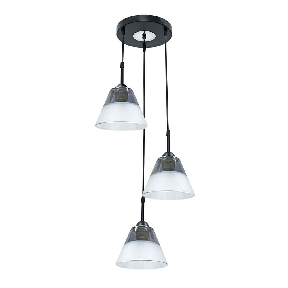 Модель предназначена для освещения бытовых помещений площадью 10–15 квадратных метров и совместима с лампами накаливания или светодиодными лампами. Цветовое решение представлено сочетанием черного с гальваническим хромом, а в качестве рассеивателей выступают стеклянные конусы в форме трапеции с матово-прозрачной фактурой: прозрачный серый и белый матовый.