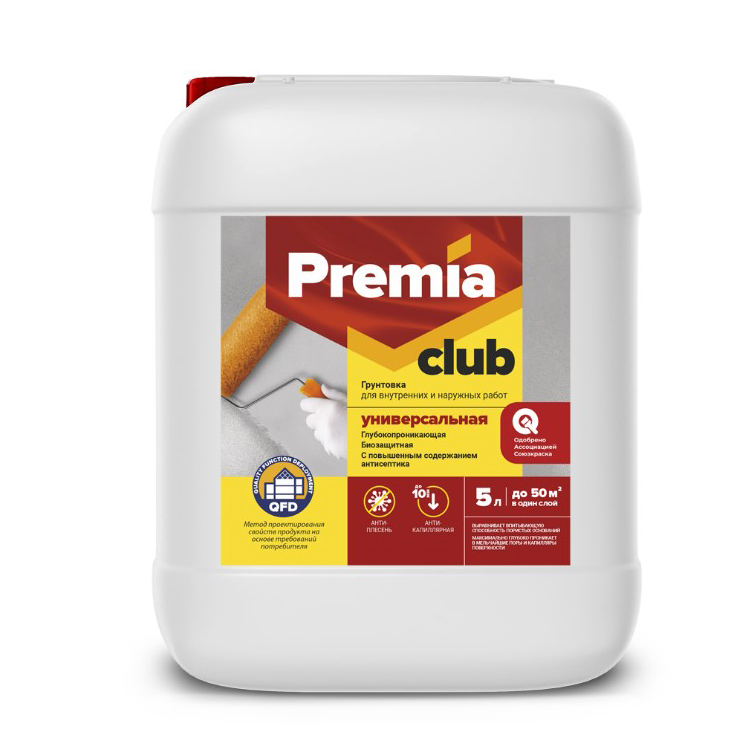 Акриловая универсальная глубокопроникающая грунтовка PREMIA CLUB с усиленной защитой от появления и развития плесени и грибка. Для наружных и внутренних работ, в т.ч. в помещениях с повышенной влажностью. Максимально глубоко проникает даже в мельчайшие капилляры и отлично укрепляет пористые основания. Выравнивает впитываемость поверхности, обеспечивая однотонность финишного покрытия, значительно снижает расход краски. Увеличивает срок службы финишного покрытия. Рекомендуется использовать в комплексе с материалами PREMIA CLUB.