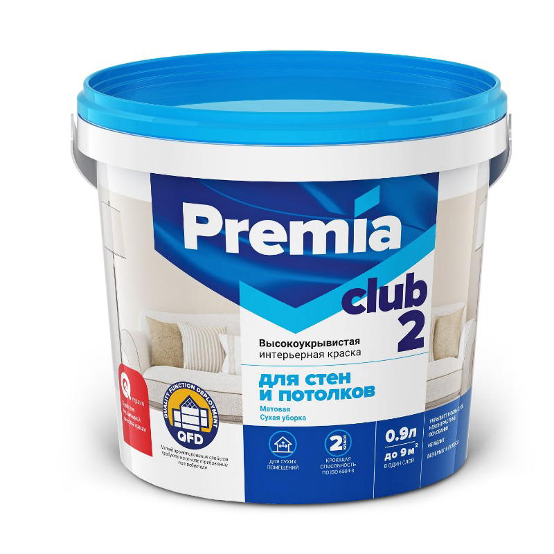 Экологичная акриловая Краска PREMIA CLUB 2 предназначена для стен и потолков в сухих помещениях не подверженных сильным загрязнениям. Образует гладкое матовое, ярко белое покрытие, устойчивое к сухой уборке. Обладает хорошей кроющей способностью. Удобна и технологична в работе: не образует потеков, не капает с малярного инструмента. Рекомендуется для окраски детских, спортивных и лечебных учреждений.