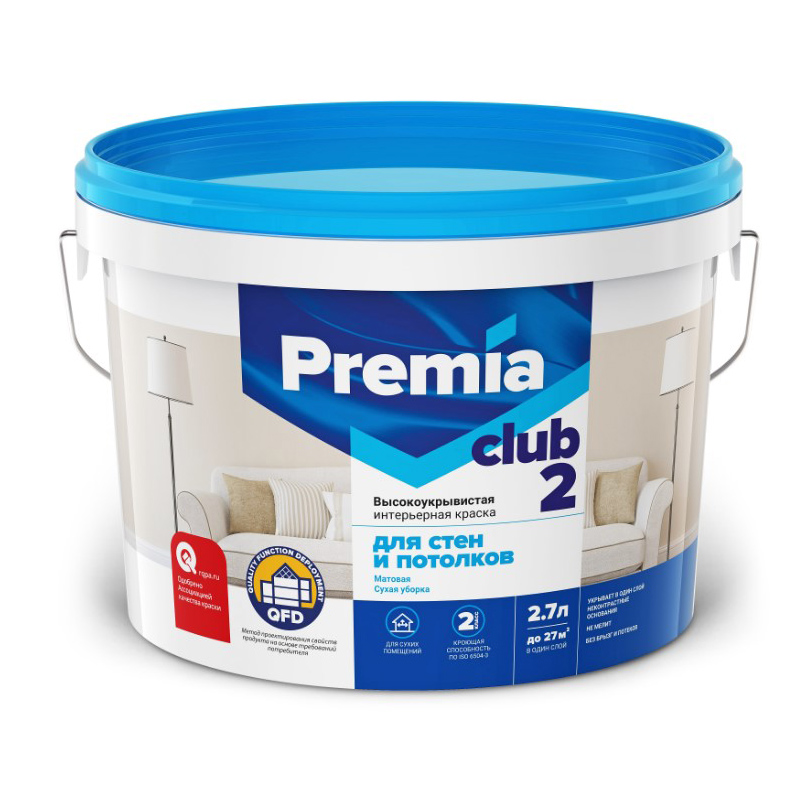 Экологичная акриловая Краска PREMIA CLUB 2 предназначена для стен и потолков в сухих помещениях не подверженных сильным загрязнениям. Образует гладкое матовое, ярко белое покрытие, устойчивое к сухой уборке. Обладает хорошей кроющей способностью. Удобна и технологична в работе: не образует потеков, не капает с малярного инструмента. Рекомендуется для окраски детских, спортивных и лечебных учреждений.