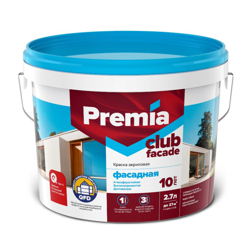 Экологичная акриловая фасадная краска PREMIA CLUB предназначена для окраски фасадов зданий, открытых помещений под навесом (балкон, лоджия, веранда), а так же для работ внутри жилых, общественных, производственных помещений с постоянным и временным пребываем людей, зданий типа А, Б, В. Образует прочное, долговечное «дышащее» покрытие, обладающее высокой устойчивостью к атмосферным воздействиям (осадки, солнечное излучение, перепады температур), в том числе в условиях северных широт.
