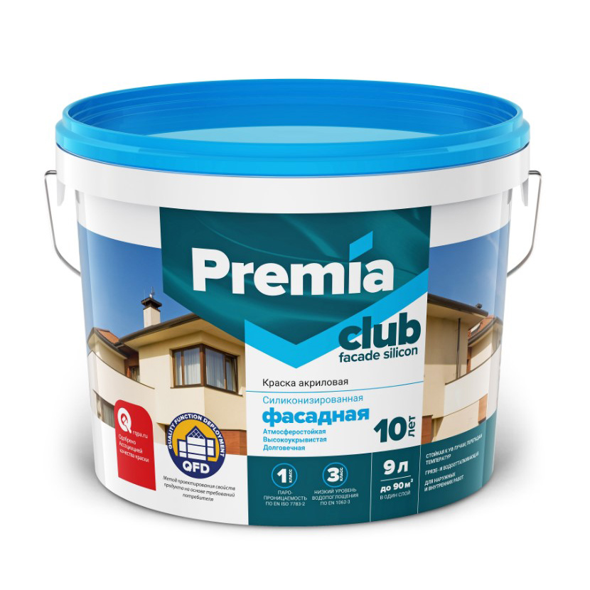 Экологичная акриловая фасадная краска PREMIA CLUB с добавкой силикона предназначена для окраски фасадов зданий, открытых помещений под навесом (балкон, лоджия, веранда), а так же для работ внутри жилых, общественных, производственных помещений, в т.ч. с повышенной влажностью, с постоянным и временным пребываем людей, зданий типа А, Б, В. Покрытие обладает высоким коэффициентом паропроницаемости (1 класс), фасад «дышит», обеспечивая стенам правильный влаго- и воздухообмен. Добавка силикона придает поверхности повышенные водо- и грязеотталкивающие свойства. Покрытие обладает высокой устойчивостью к атмосферным воздействиям (осадки, солнечное излучение, перепады температур), в том числе в условиях северных широт. Срок службы покрытия составляет не менее 10 лет при соблюдении технологии нанесения.