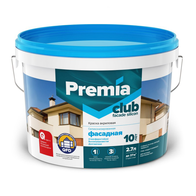 Экологичная акриловая фасадная краска PREMIA CLUB с добавкой силикона предназначена для окраски фасадов зданий, открытых помещений под навесом (балкон, лоджия, веранда), а так же для работ внутри жилых, общественных, производственных помещений, в т.ч. с повышенной влажностью, с постоянным и временным пребываем людей, зданий типа А, Б, В. Покрытие обладает высоким коэффициентом паропроницаемости (1 класс), фасад «дышит», обеспечивая стенам правильный влаго- и воздухообмен. Добавка силикона придает поверхности повышенные водо- и грязеотталкивающие свойства. Покрытие обладает высокой устойчивостью к атмосферным воздействиям (осадки, солнечное излучение, перепады температур), в том числе в условиях северных широт. Срок службы покрытия составляет не менее 10 лет при соблюдении технологии нанесения.
