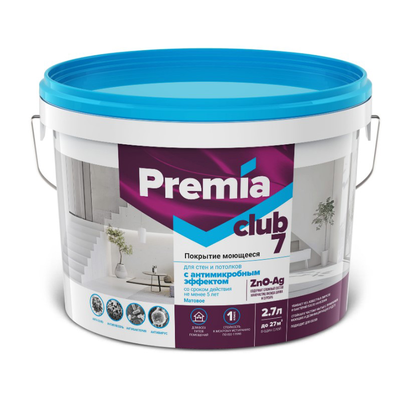 Покрытие (краска) PREMIA моющееся с антимикробным эффектом (эффективное в том числе в отношении короновируса SARS-CoV-2), антибактериальное (эффективное в том числе в отношении внутрибольничных инфекций) и антигрибковое с пролонгированными сроками действия. Антивирусный, антибактериальный эффект достигнут в результате введения в состав агента нового поколения. Эффективность доказана в ФНИЦ ЭМ им. Н.Ф. Гамалеи. Предназначена для окраски стен и потолков для любых типах помещений (вкл. медицинского профиля) с высокой эксплуатационной нагрузкой. Образует гладкое матовое покрытие, устойчивое к влажной уборке с применением растворов неабразивных моющих и санитарных средств без потери антимикробной защиты.