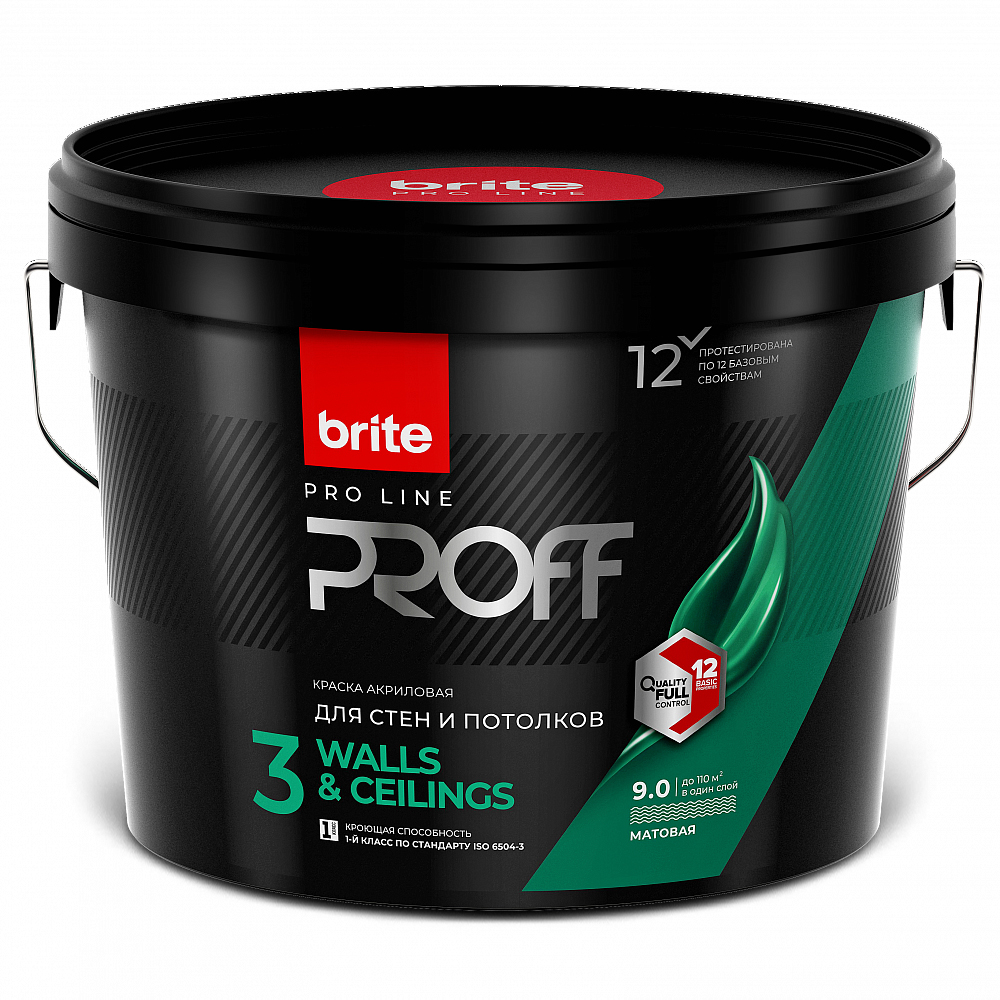 Профессиональная акриловая краска Brite Professional для стен потолков образует супербелое матовое покрытие, устойчивое к сухой и легкой влажной уборке. Краска имеет 1-й класс по кроющей способности при расходе 7-11 м²/л (в зависимости от контрастности подложки) и 2 -й класс по стойкости к влажному истиранию по стандарту DIN EN 13300 . Удобна при нанесении, не брызгает с малярного инструмента, легко и ровно наносится, имеет хороший розлив. Подходит для обоев под окраску. Краска обладает хорошей укрывистостью в мокром слое, что позволяет до момента высыхания оценить расход материала и оптимальное количество наносимой краски на окрашиваемую поверхность. Краска экологически безопасна.