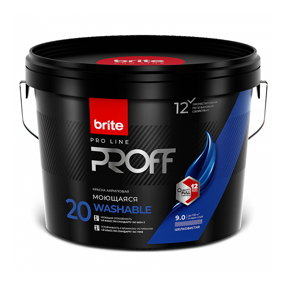 Профессиональная акриловая краска Brite Professional Full Control интерьерная моющаяся шелковистая предназначена для ответственных работ по отделке стен и потолков (по гипсокартонным, кирпичным, бетонным, оштукатуренным, зашпатлеванным поверхностям) в жилых и общественных помещениях зданий категорий А,Б,В с высокой эксплуатационной нагрузкой, требующих частой влажной уборки. Образует благородное покрытие с легким шелковистым блеском. Покрытие соответствует 1-му классу стойкости к влажному истиранию.