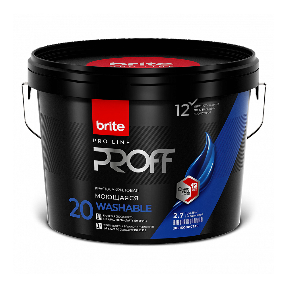 Профессиональная акриловая краска Brite Professional Full Control интерьерная моющаяся шелковистая предназначена для ответственных работ по отделке стен и потолков (по гипсокартонным, кирпичным, бетонным, оштукатуренным, зашпатлеванным поверхностям) в жилых и общественных помещениях зданий категорий А,Б,В с высокой эксплуатационной нагрузкой, требующих частой влажной уборки. Образует благородное покрытие с легким шелковистым блеском. Покрытие соответствует 1-му классу стойкости к влажному истиранию.
