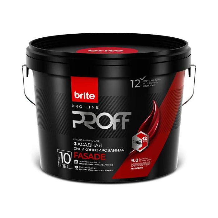 Профессиональная акриловая краска Brite Professional FC фасадная силиконизированная предназначена для ответственных работ по окраске кирпичных, бетонных, оштукатуренных фасадов и цоколей зданий категории А, Б, В для защиты от атмосферных воздействий и придания зданию эстетичного внешнего вида. Может применяться для внутренних работ для помещений с высокой влажностью. Образует долговечное «дышащее» покрытие, обладающее устойчивостью к атмосферным воздействиям (осадки, солнечное излучение, перепады температур), в том числе в условиях северных широт. Особенно удобна при нанесении на вертикальные поверхности, не брызгает с малярного инструмента, легко и ровно наносится, имеет хороший розлив. Рекомендуется наносить в 2 слоя.