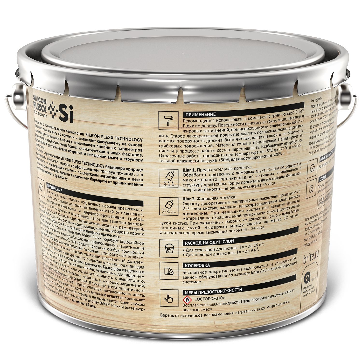 Материал хорошо впитывается в древесину, активные вещества проникают максимально глубоко в структуру дерева и не вымываются. Покрытие легко наносится без разбрызгивания и потёков. Срок службы комплексного покрытия (грунт-основа по дереву Brite Flexx и экстерьерного покрытия Brite Flexx) – не менее 15 лет.