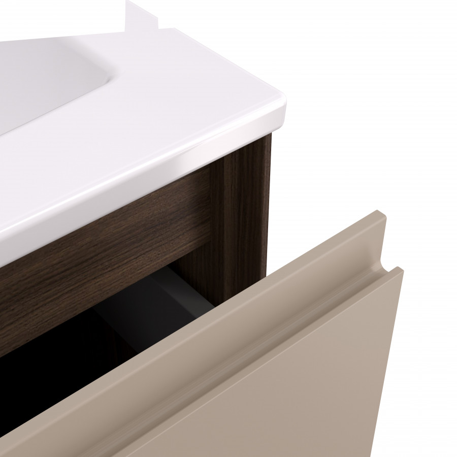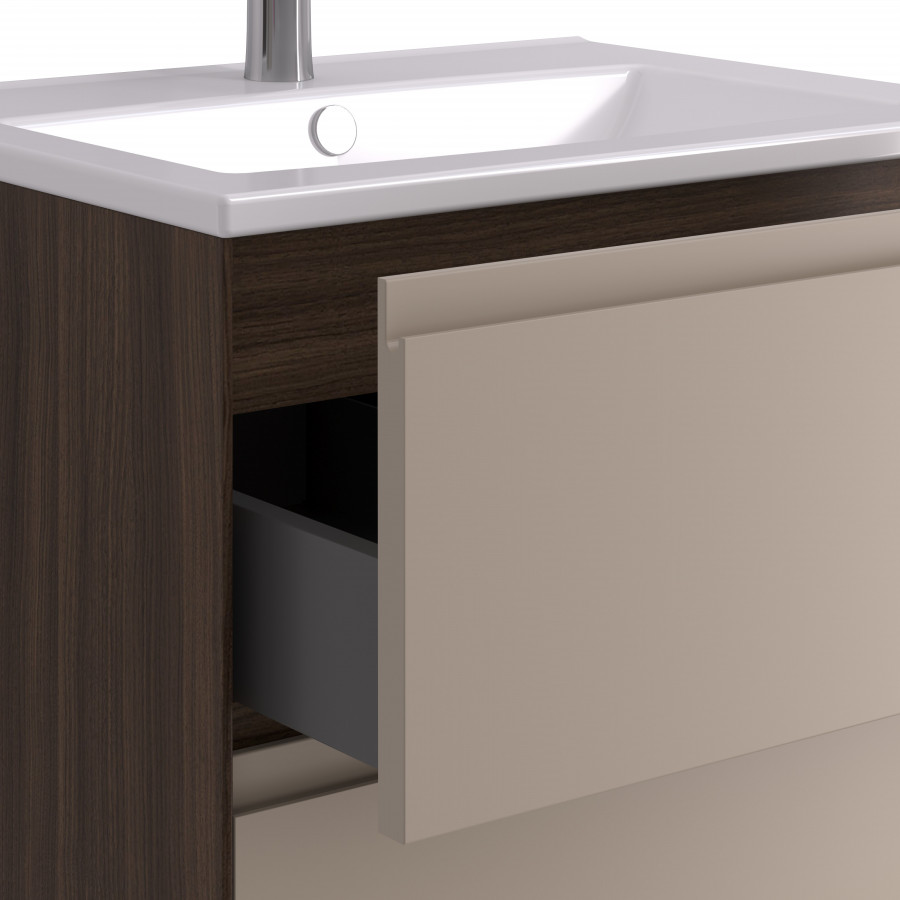 Коллекция мебели Люмин - минималистичное и практичное решение для ванной комнаты. Корпус, фасады и внутренняя организация тумб изготовлены из влагостойкой ЛДСП. Фасады выполнены в бежевом гладком исполнении, а корпус в темном насыщенном текстурированном дереве. Боковины тумб обработаны по особой технологии, создающей эффект тонких линий и в то же время сохраняющей надежность конструкции.