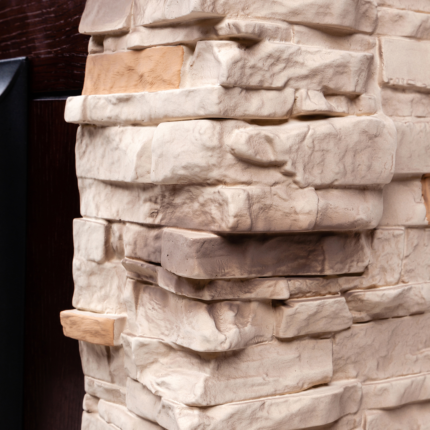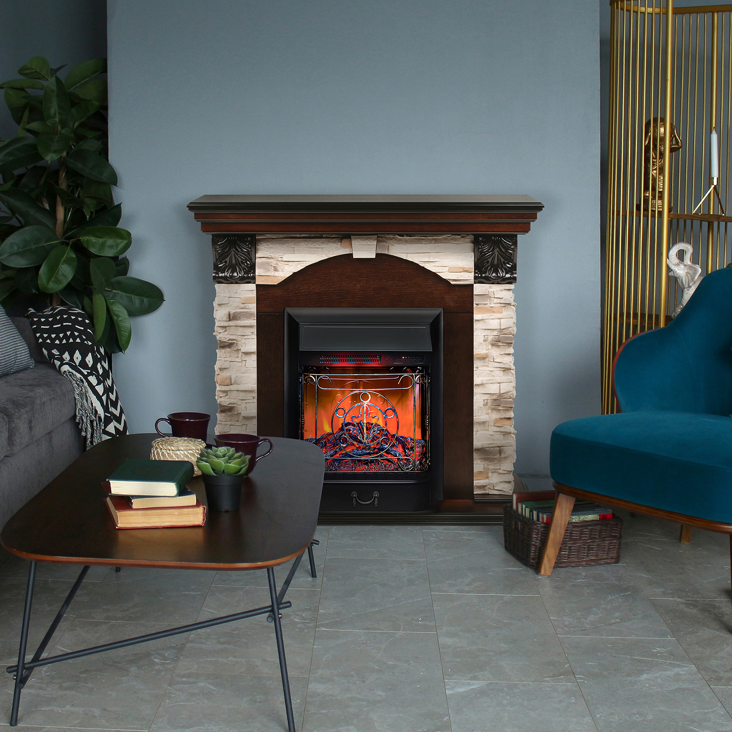 Основная часть портала камина выполнена из МДФ и искусственного камня. Тип очага — открытый. Для создания оптимальной температуры в помещении устройство рекомендуется размещать в комнатах, площадь которых составляет не более 15 м². Модель подходи для напольного монтажа возле стены. Доступна работа в двух режимах обогрева. Яркость пламени можно регулировать. Установлены звуковые эффекты потрескивания дров.