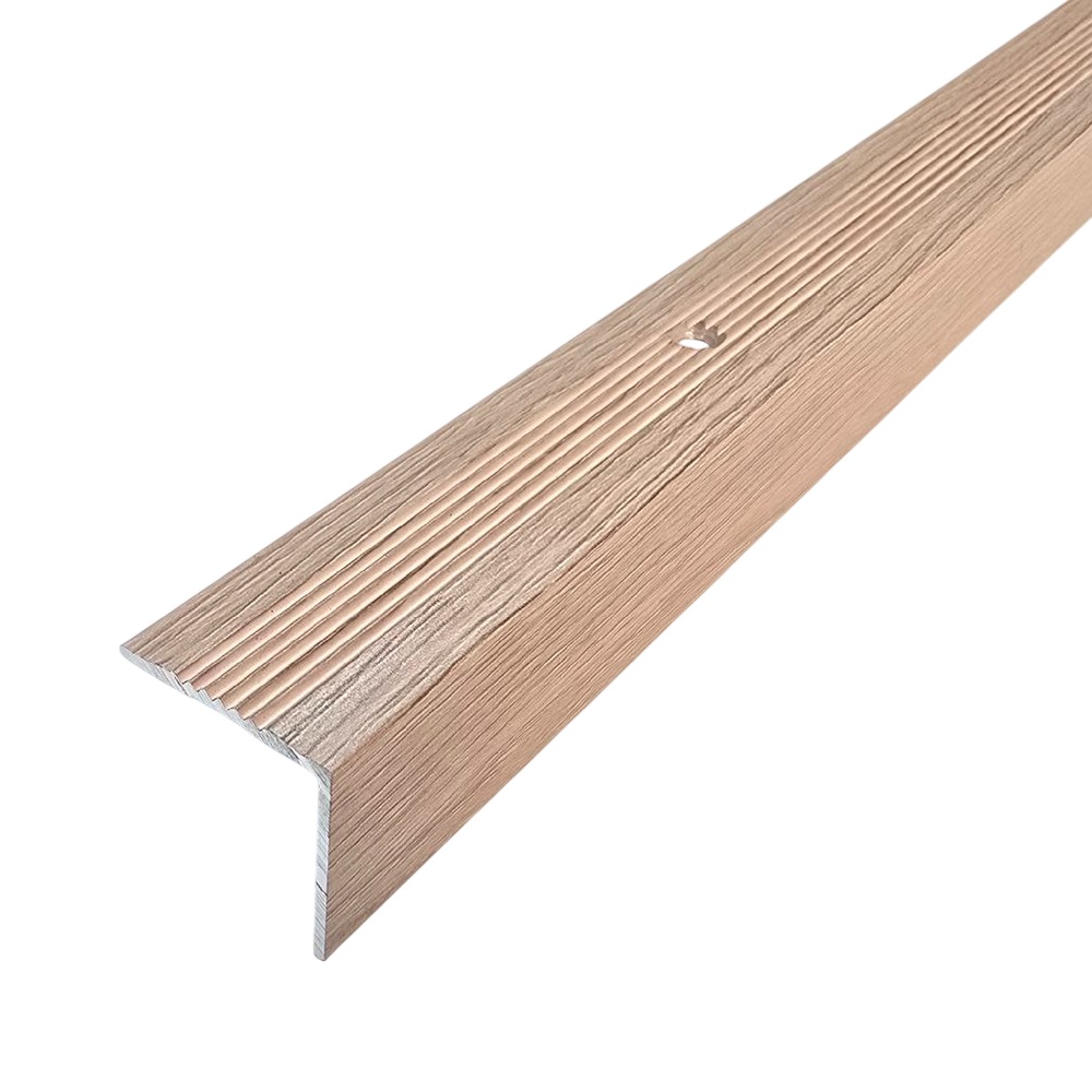 Угловой профиль с открытым креплением используется в качестве накладки на ступени. Он позволяет скрывать щели, неровности среза и другие дефекты, а также открывает широкие возможности для реализации дизайнерских решений. Применение углового порожка для ступеней помогает маскировать компенсационные швы при изготовлении лестниц. С его помощью можно оформлять переходы между разными уровнями — это может потребоваться при монтаже дощатых и паркетных полов, а также при соединении напольных покрытий.