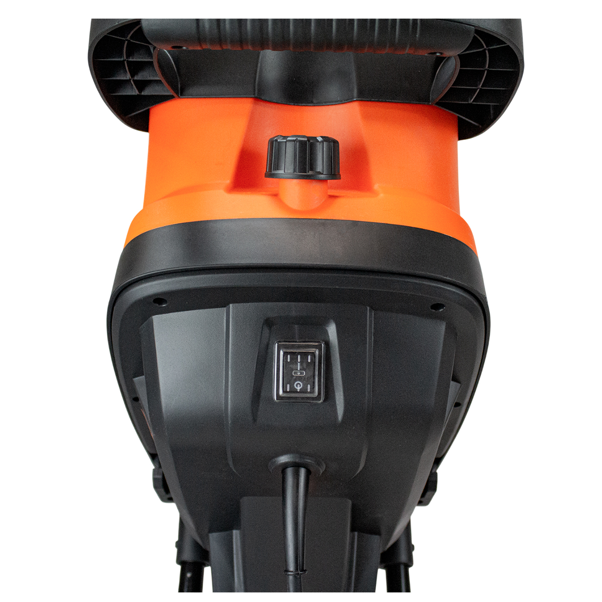 Электрический садовый измельчитель применяется для переработки органических садовых отходов — материалов биологического происхождения (веток, листвы, увядших цветов и аналогичных). Рукоятка и два колеса обеспечивают удобство перемещения агрегата по участку. Благодаря работе от электричества, измельчитель отличается экологичностью и простотой использования.