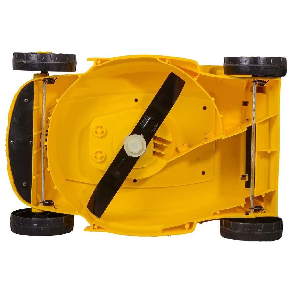Высота среза регулируется индивидуально в диапазоне от 20 до 55 мм. Скорость вращения металлических ножей составляет 3100 об./мин, этого достаточно для эффективной стрижки газона, скашивания мягкой поросли. Ширина среза составляет 320 мм. Скошенная трава поступает в пластиковый резервуар объемом 35 л, что избавляет от дополнительных работ по уборке. Электрическая газонокосилка весит 8,5 кг. Она оснащена 4 колесами и длинной двойной ручкой для удобства передвижения по местности. Управление расположено с правой стороны рукоятки.