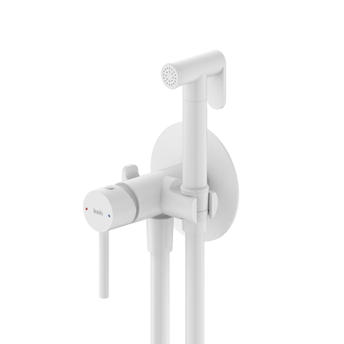 Встраиваемый смеситель с гигиеническим душем Axes в стильном матовом белом цвете – практичный и стильный, его дизайн сочетает в себе трендовый минимализм форм и округлые формы. Имеет крючок для полотенца, который можно установить как слева, так и справа, меняя местами с держателем для лейки. Душевой шланг с защитой от перекручивания в комплекте (длина 1,2 м).