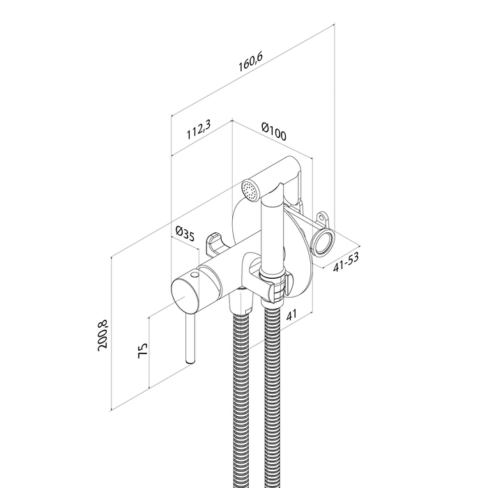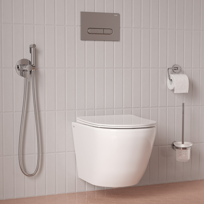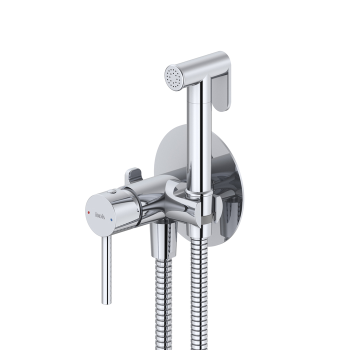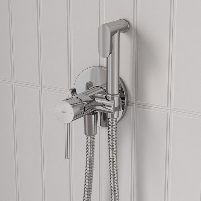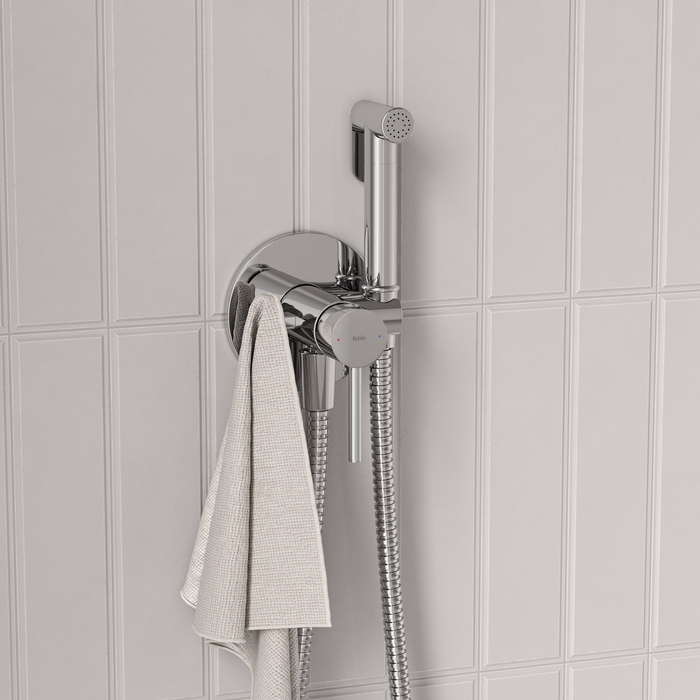 Встраиваемый смеситель с гигиеническим душем Axes в универсальном хроме – практичный и стильный, его дизайн сочетает в себе трендовый минимализм форм и округлые формы. Имеет крючок для полотенца, который можно установить как слева, так и справа, меняя местами с держателем для лейки. Душевой шланг с защитой от перекручивания в комплекте (длина 1,2 м).