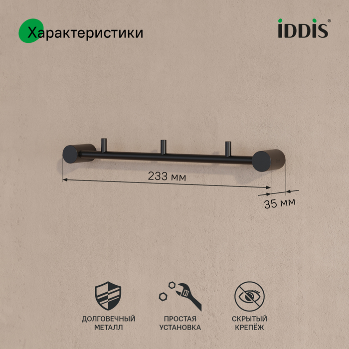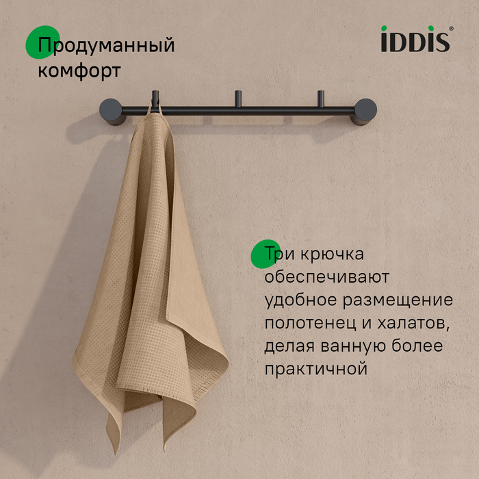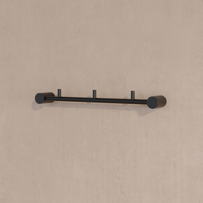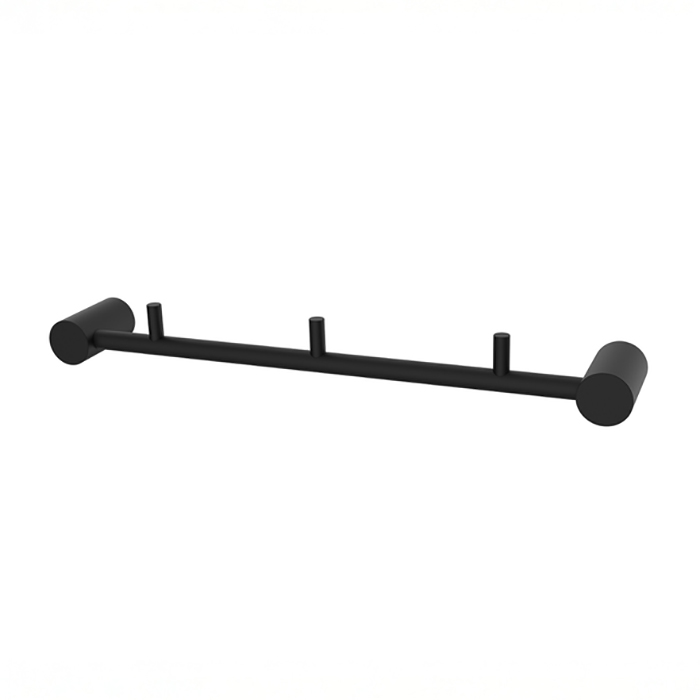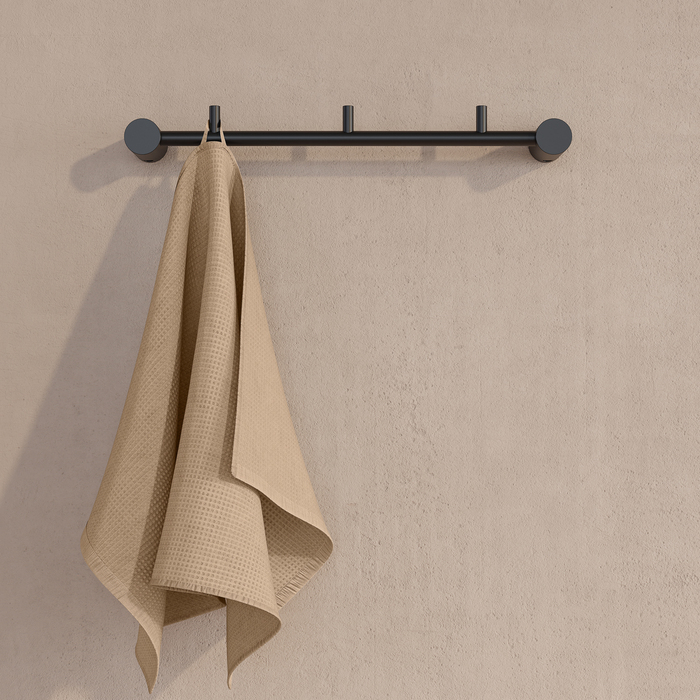 Планка с тремя крючками Petite в чёрном матовом цвете позволит с комфортом разместить несколько банных полотенец и халатов, дополнив места для хранения в ванной. Основной материал – нержавеющая сталь, что позволяет эксплуатировать аксессуары во влажном помещении ванной и даже в жёсткой воде на протяжении длительного времени. Повышенная стойкость к бытовой химии и механическим повреждениям благодаря надёжному PVD-покрытию.