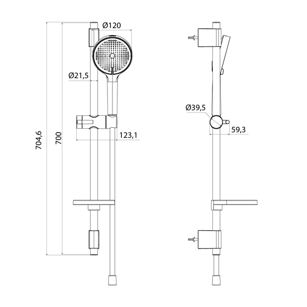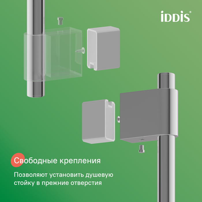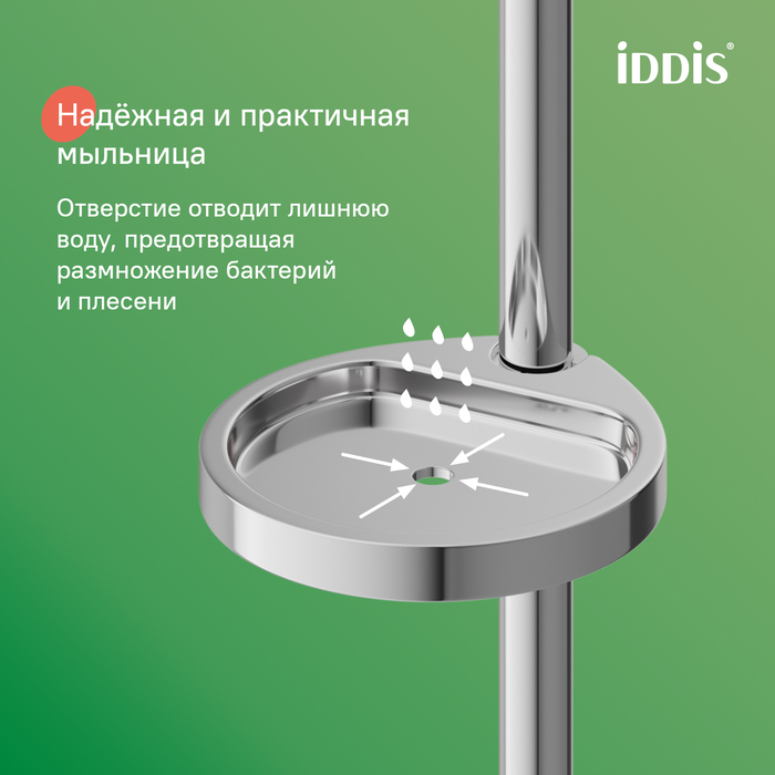 Есть удобная полочка-мыльница. Оптимальный размер душевой стойки – 700 мм. Свободные крепления позволяют установить стойку в прежние отверстия и не портить плитку. Держатель для лейки с произвольным углом наклона из качественного ABS-пластика и гибкий ПВХ-шланг (1,5 м) с функцией защиты от перекручивания идут в комплекте.