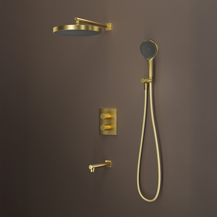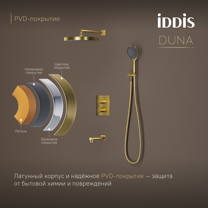 Встраиваемая душевая система с термостатом, тропическим и ручным душем и изливом Duna – воплощение актуальных трендов в дизайне смесителей в безупречном исполнении: фрезеровка, модные цвета и фактуры. Ручка выполнена из латуни для сохранения чёткости линий фрезеровки. Европейские комплектующие и технологии — для премиального качества.