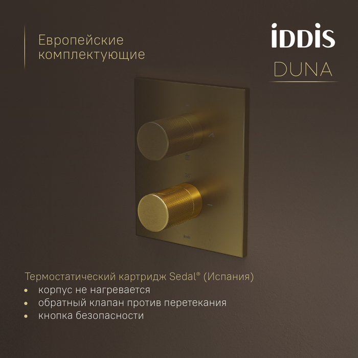 Без риска ожогов: термостатический картридж Sedal (Испания) обеспечивает стабильную температуру, комфорт и безопасность. Подключён напрямую к горячей воде — корпус смесителя не нагревается. Увеличенная кнопка безопасности для полной защиты от ожогов: интегрирована в ручку, не выбивается из дизайна и легко нажимается, фиксация на 38° защищает от случайного включения горячей воды.