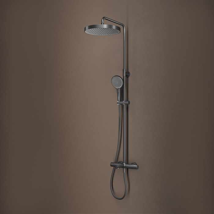 Душевая система с термостатом, тропическим и ручным душем и изливом Duna – воплощение актуальных трендов в дизайне смесителей в безупречном исполнении: фрезеровка, модные цвета и фактуры. Ручка выполнена из латуни для сохранения чёткости линий фрезеровки. Горячая вода подключается слева.
