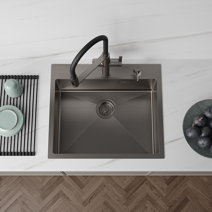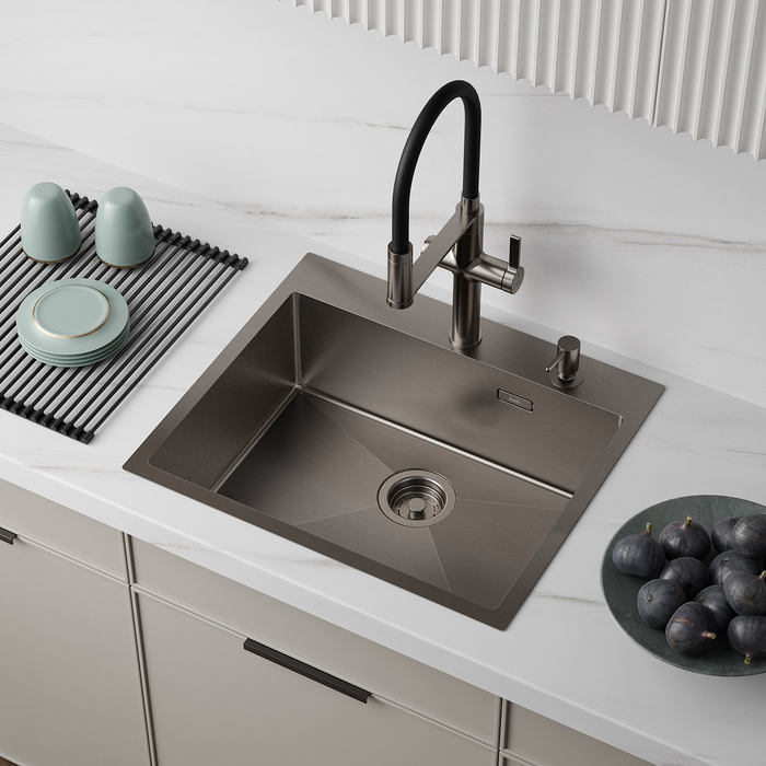 - красивый и стойкий графитовый цвет достигается путем обработки мойки парообразным металлом: частички краски проникают в структуру стали и образуют микрослой (PVD-покрытие) на поверхности