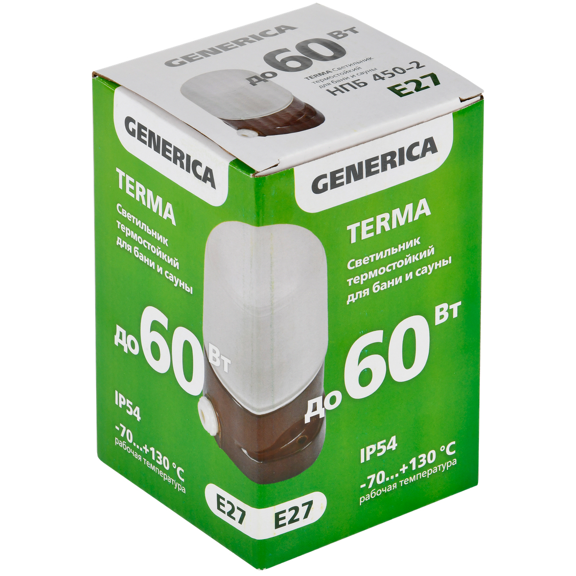 Светильник НПБ серии 450 торговой марки GENERICA предназначен для применения в бытовых помещениях с высоким содержанием пыли и влаги, а так же с предельной температурой окружающей среды до 140 °С, например в банях и саунах.