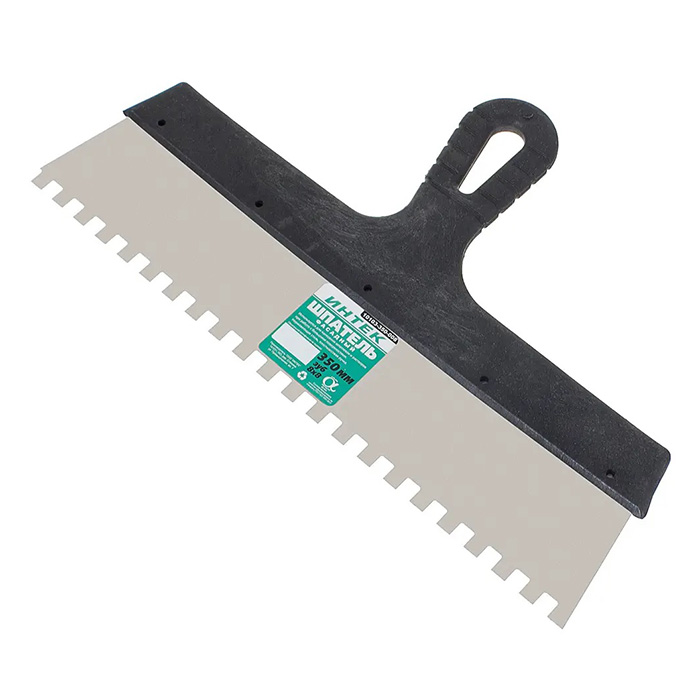 Шпатель фасадный зубчатый, идеально подойдёт для работ на большой площади. Наличие зубцов 8х8 мм позволит равномерно распределять смесь, не допуская перерасхода. Рабочее полотно выполнено из нержавеющей стали толщиной 0,4 мм, не подверженной коррозии. Удобная ручка из полипропилена надёжно прикреплена к рабочей части и будет комфортно лежать в руке. Отверстие в ручке используется для подвешивания инструмента на держатель.
