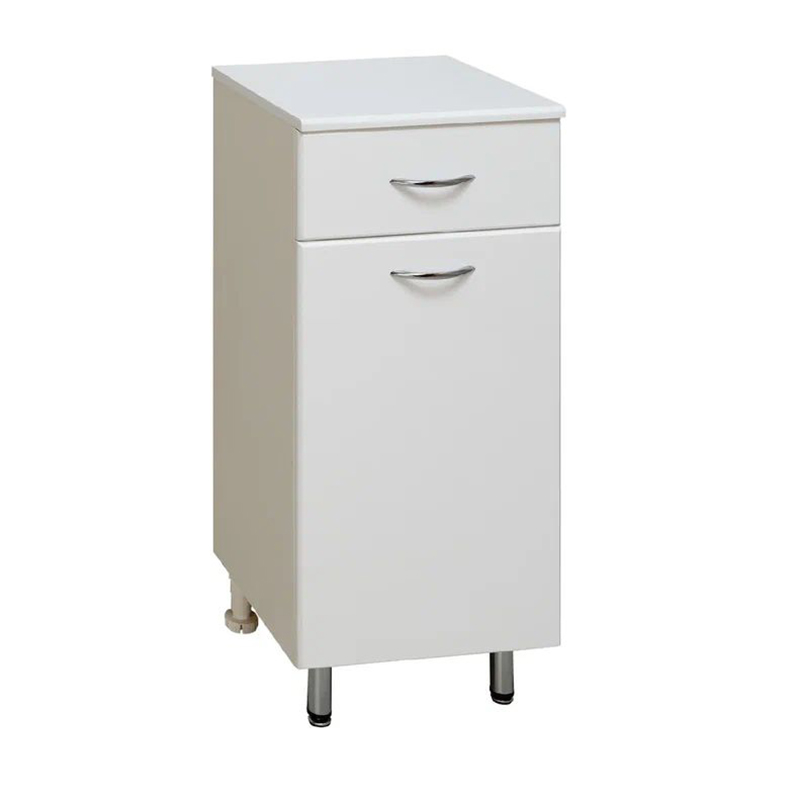 Тумба в ванную (полупенал) с одним выдвижным ящиком и откидной дверью. Нижнее отделение комплектуется одной внутренней полкой и корзиной для белья. Ящик - на шариковых направляющих, петли со встроенным доводчиком, ручки - 2шт, ножки хром - 2 шт, ножки пластик -2шт.