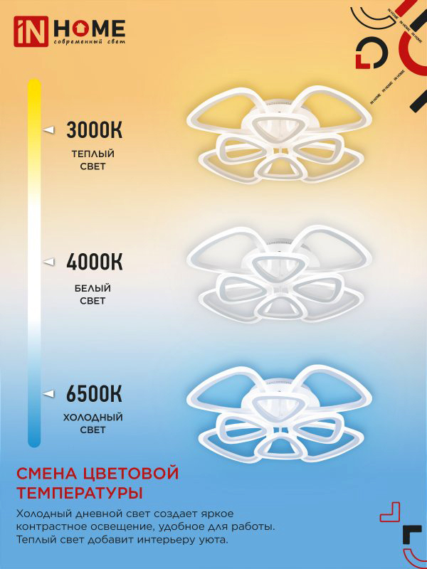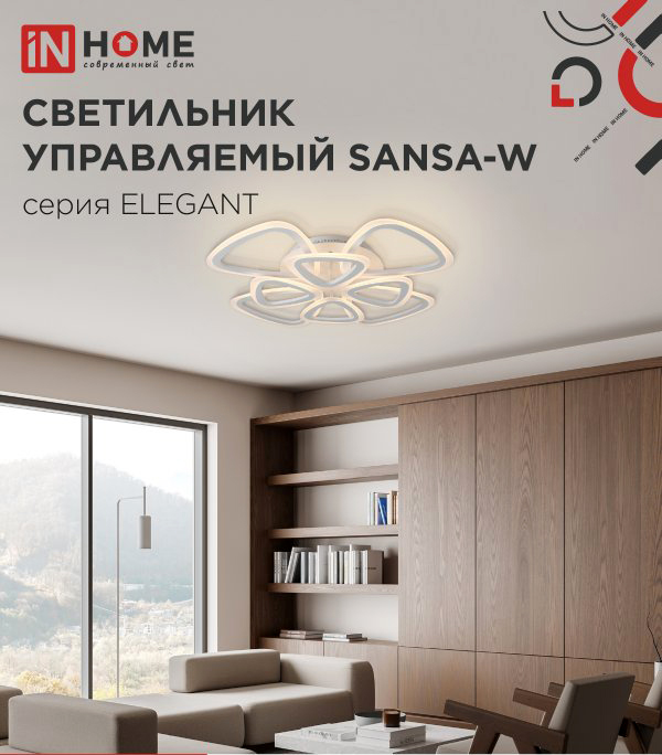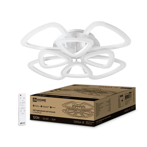 Серия ELEGANT от компании IN HOME современные технологии и эффектный дизайн. Потолочные светодиодные люстры модели SANSA выполнены в форме геометрического цветка с восемью лепестками белого цвета. Управлять светодиодной люстрой можно с помощью пульта дистанционного управления или с помощью выключателя.