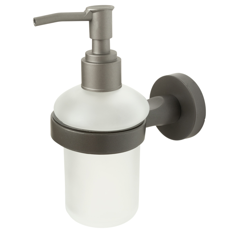 Подвесной дозатор с держателем предназначен для порционной подачи мыла, шампуней и других гелеобразных жидкостей. Ёмкость изготовлена из матового стекла. Подача моющего средства осуществляется с помощью пластиковой помпы. Изготовленный из металла держатель обладает устойчивостью к влаге. Монтируется к стене при помощи крепления, входящего в комплект.