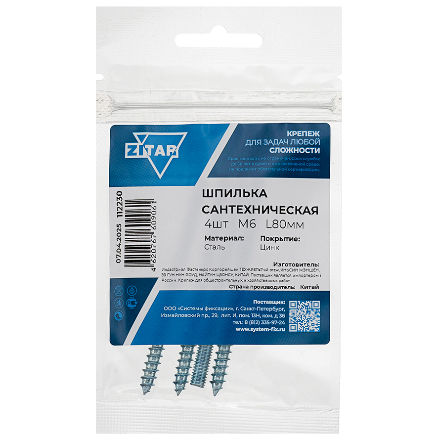 Шпилька сантехническая ZITAR 6х80 4шт