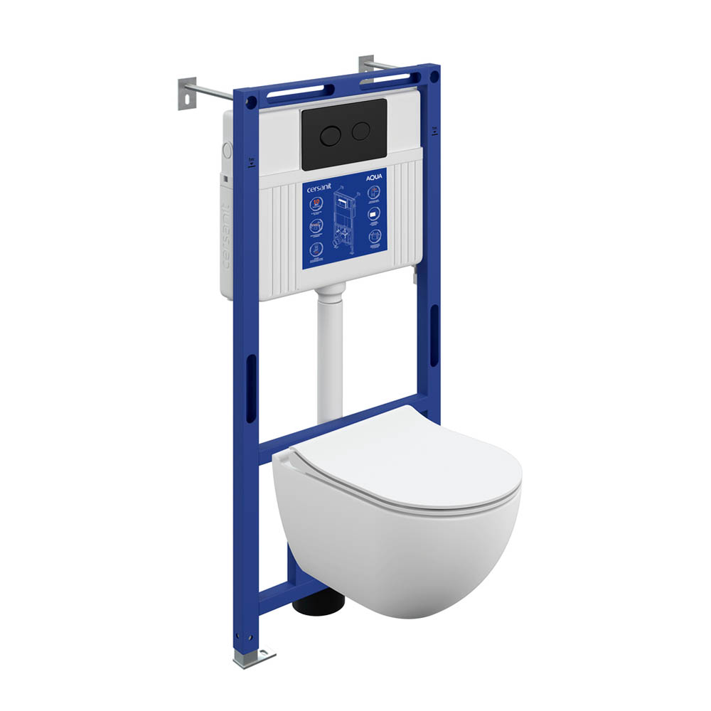 Комплект инсталляция с унитазом — это готовое решение для санузла. В него включена пневматическая инсталляция AQUA 50 PRIME P (ширина 50 см) с механизмом двухуровневого слива на 3 и 6 литров, а также подвесной унитаз BRASKO SMART без ободка. Унитаз отличается монолитным современным дизайном, имеет ультратонкое антибактериальное сиденье из дюропласта с функцией плавного закрывания (soft-close) и легким съемом. Завершает набор матовая черная кнопка ACCENTO CIRCLE из пластика.