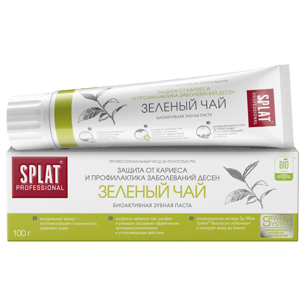 Зубная паста SPLAT Professional «Зелёный чай» разработана для защиты от кариеса и профилактики заболевания десен. Экстракты зеленого чая, шалфея и ромашки оказывают успокаивающее действие в полости рта. Натуральный жемчуг содержит кальций и аминокислоты для укрепления эмали. Биоконцентрат лаванды обладает мощным антисептическим эффектом и благотворно действует на десны. Инновационная система Sp.White System безопасно отбеливает и полирует эмаль.