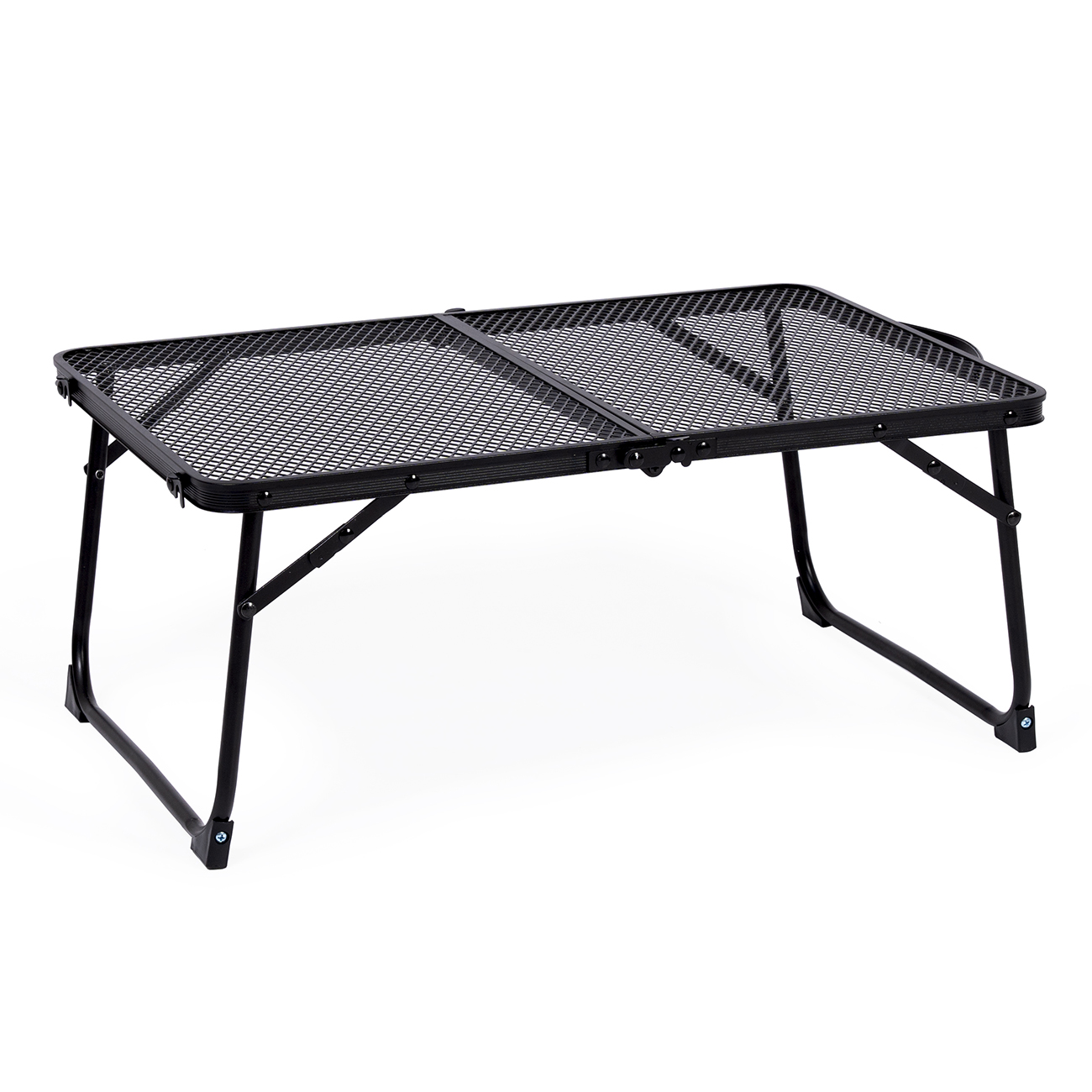 Стол складной размером 60×40×27/56 см выполнен из прочного металла с износостойким чёрным покрытием, что обеспечивает ему долговечность и устойчивость к внешним воздействиям. Особенностью данной модели является удобная сетчатая столешница, которая не только облегчает уход за столом, но и позволяет ставить на неё горячую посуду, а также мыть овощи и фрукты прямо на поверхности — вода и крошки не задерживаются, а всё лишнее легко удаляется.
