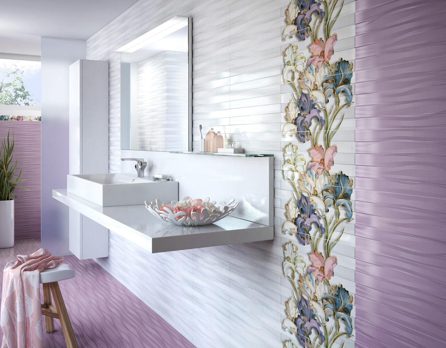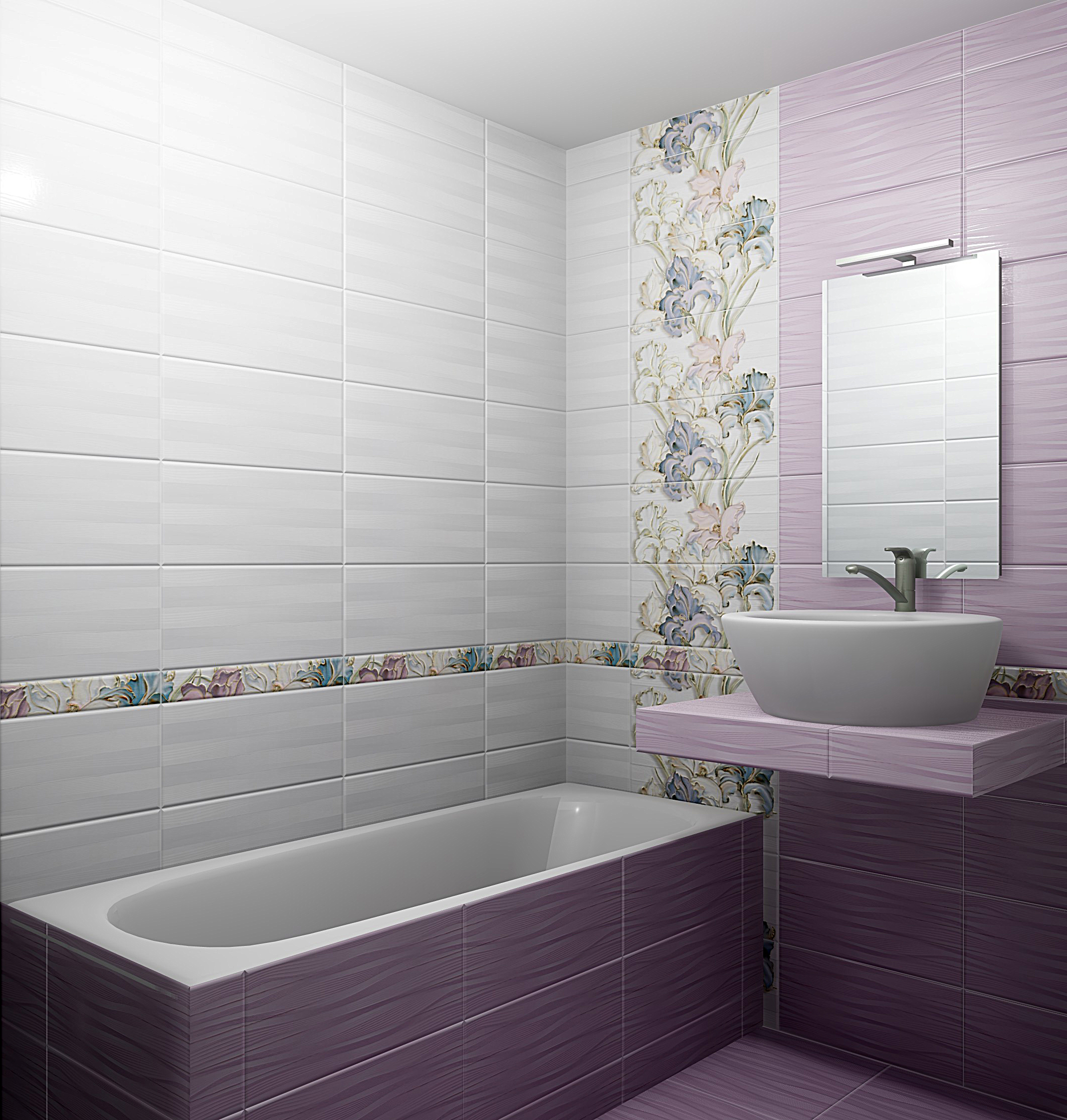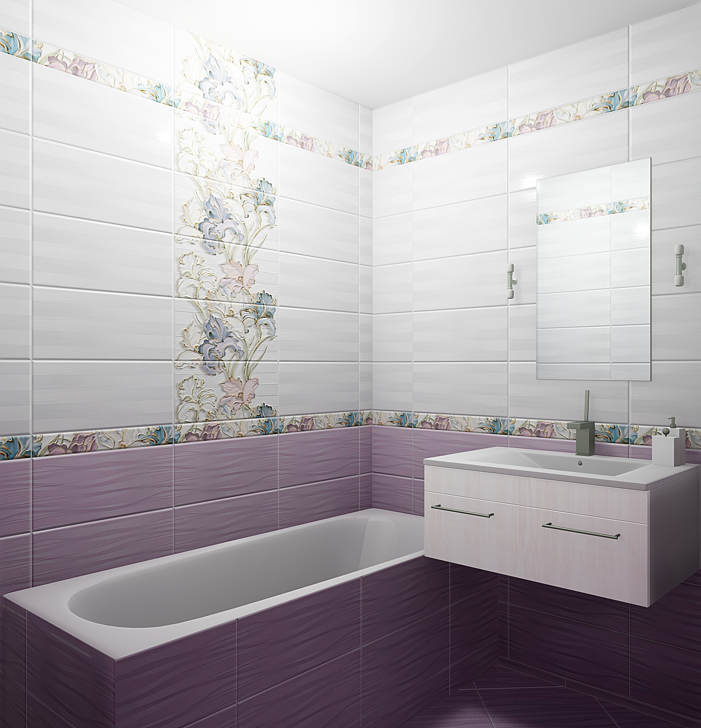 Керамическая плитка Batik — это изящная и светлая коллекция, созданная итальянскими дизайнерами. Коллекция состоит из двух видов светлого лилового и серого цветов и стильного декора с цветочным принтом. Нежные ирисы, филигранно выполненные в мягких оттенках, смотрятся особенно изящно в обрамлении простого орнамента из переплетения линий.