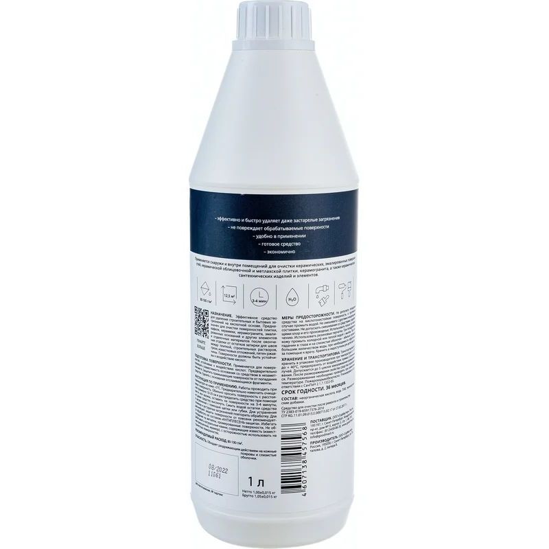 Эффективный состав для удаления строительных и бытовых загрязнений на кислотной основе. Предназначен для очистки поверхностей плитки, кафеля, керамики, керамогранита, эмалированных оснований и других элементов и отделочных материалов после окончания отделки от остатков затирки для швов между плиткой, строительных растворов, грязи, известковых отложений, пятен ржавчины. Поверхности должны быть устойчивы к воздействию кислот.