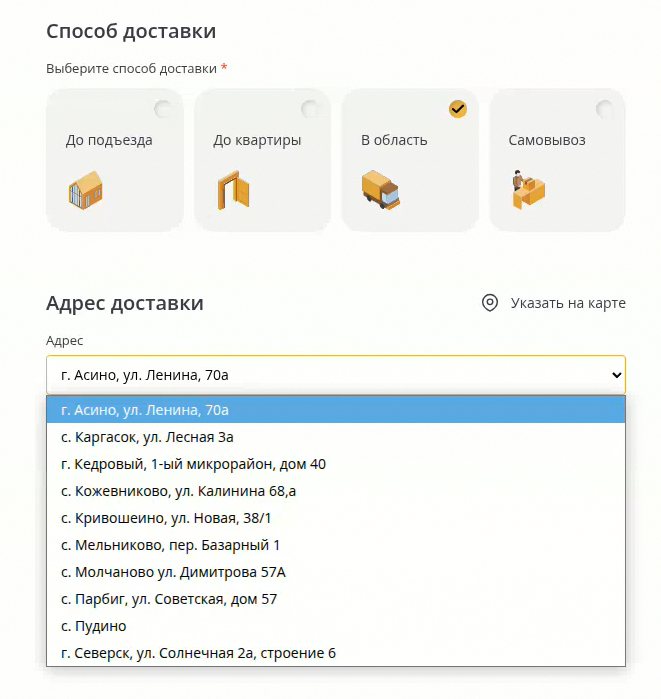 - Для жителей области, доставка доступна при выборе пункта "В область", по адресу, который соответствует вашему населенному пункту.