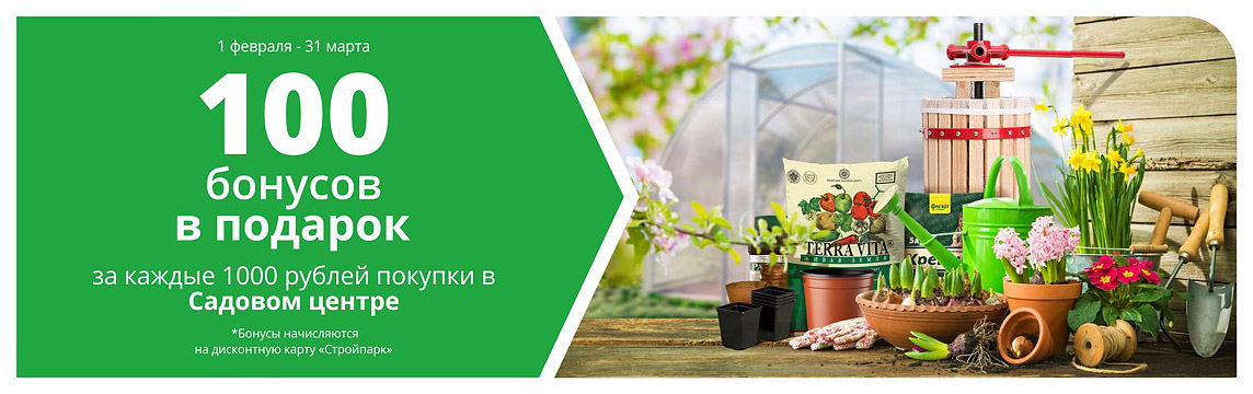 1) При покупке товара в Садовом центре за каждые полные 1000 руб. в одном чеке, после применения дисконтной карты, покупателю начисляется 100 бонусов.