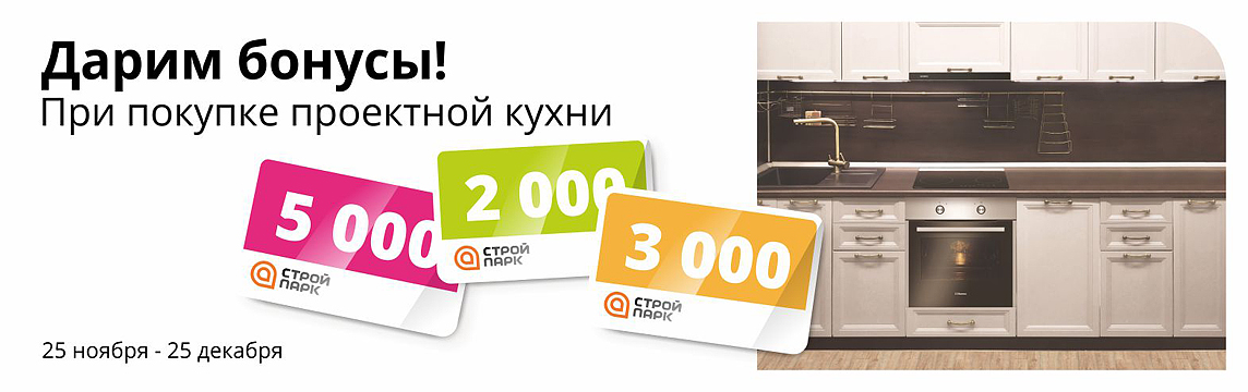 При покупке проектной кухни на сумму от 30 000 руб. (после применения Дисконтной карты) начисляются бонусы на Дисконтную карту Стройпарк :