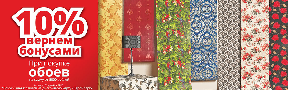 С 1 мая по 31 декабря 2019 года покупая обои на сумму от 5 000 ₽ в чеке, Вы получаете 10% бонусов от суммы покупки на карту Стройпарк.