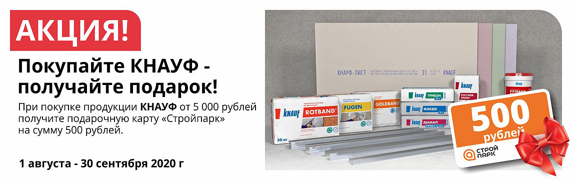 При покупке продукции Кнауф (за исключением теплоизоляции) на сумму от 5000 рублей в одном кассовом (товарном) документе, с применением дисконтной карты Стройпарк или карты ОКей, клиент получает подарочную карту, номиналом 500 рублей.